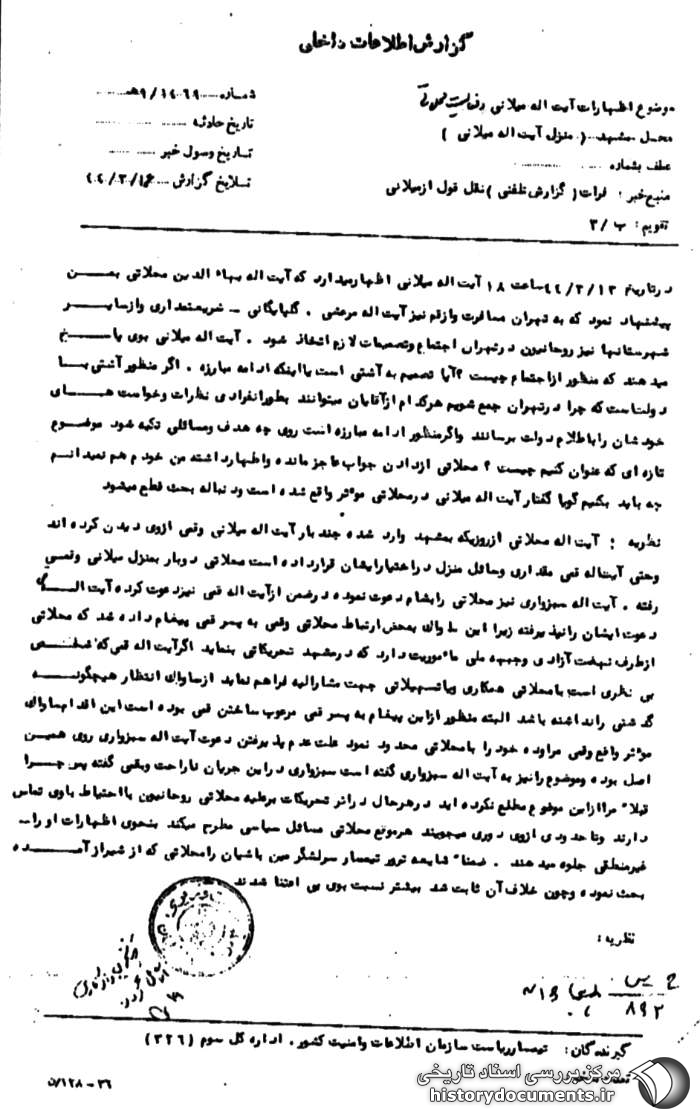 در تاریخ 13 /3 /44 ساعت 18 آیت الله میلانی اظهار می دارد که آیت الله