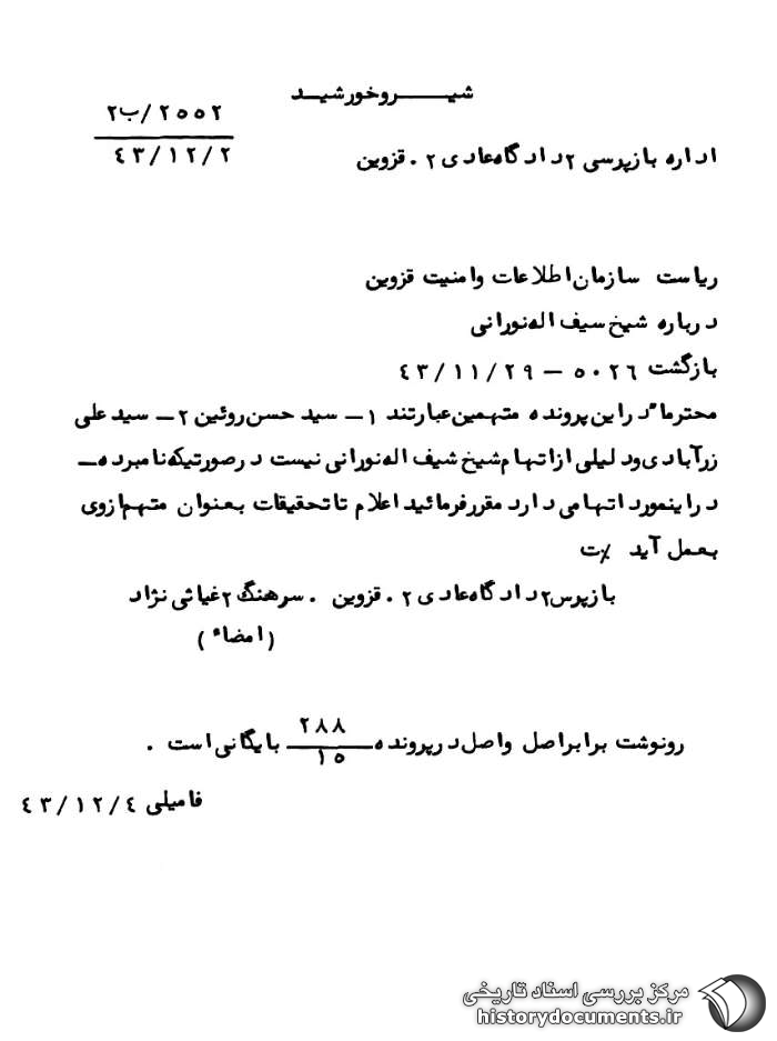 محترماً در این پرونده متهمین عبارتند از 1ـ سیدحسن روئین 2ـ سیدعلی زرآبادی و دلیلی از اتهام شیخ شیفاله نورانی نیست در صورتی که نامبرده در این مورد اتهامی دارد مقرر فرمایید اعلام تا تحقیقات به عنوان متهم از وی به عمل آید. ت
