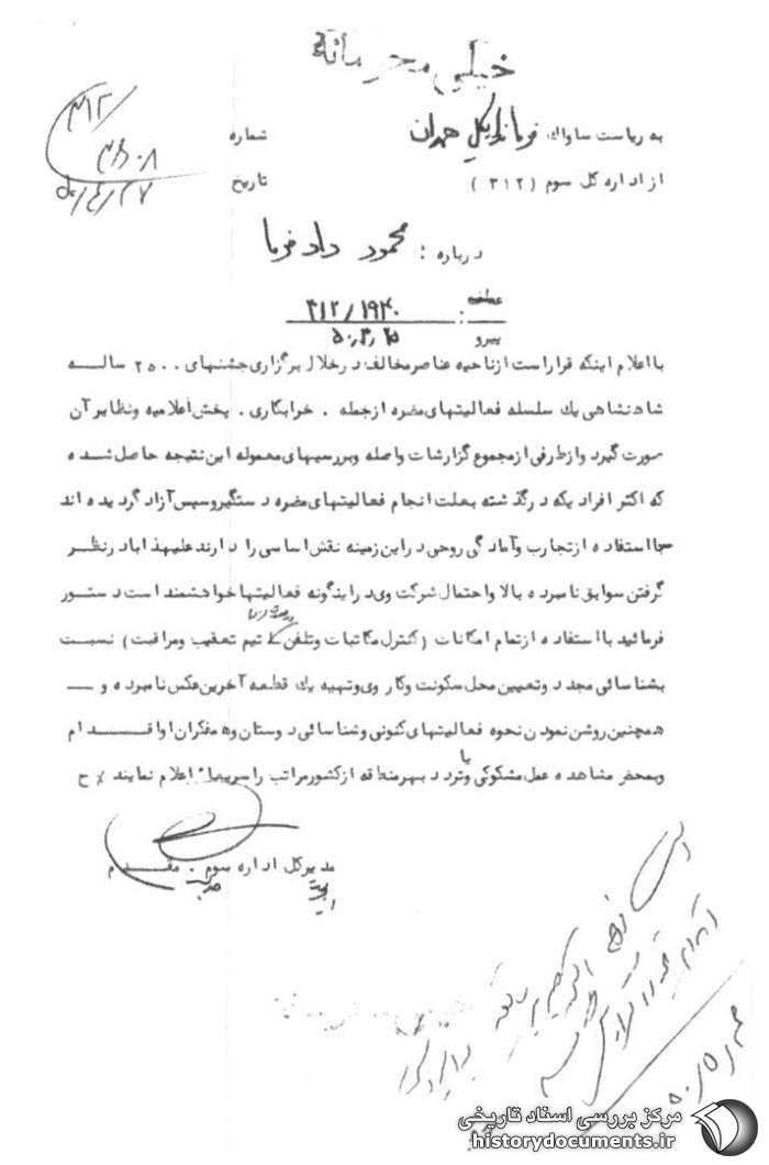 با اعلام اینکه قرار است از ناحیه عناصر مخالف در خلال برگزاری جشنهای ۲۵۰۰ ساله شاهنشاهی یک سلسله فعالیتهای مضره از جمله خرابکاری، پخش اعلامیه و نظایر آن صورت گیرد و از طرفی از مجموع گزارشات واصله و بررسیهای معموله این نتیجه حاصل شده که اکثر افرادی که در گذشته به علت انجام فعالیتهای مضره دستگیر و سپس آزاد گردیدهاند با استفاده از تجارب و آمادگی روحی در این زمینه نقش اساسی را دارند علیهذا با در نظر گرفتن سوابق نامبرده بالا و احتمال شرکت وی در اینگونه فعالیتها خواهشمند است دستور فرمایید با استفاده از تمام امکانات (کنترل مکاتبات و تلفن در صورت لزوم- تیم تعقیب و مراقبت) نسبت به شناسایی مجدد و تعیین محل سکونت و کار وی و تهیه یک قطعه آخرین عکس نامبرده و همچنین روشن نمودن نحوه فعالیتهای کنونی و شناسایی دوستان و همفکران او اقدام و به محض مشاهده عمل مشکوکی و یا تردد به هر منطقه از کشور مراتب را سریعاً اعلام نمایند