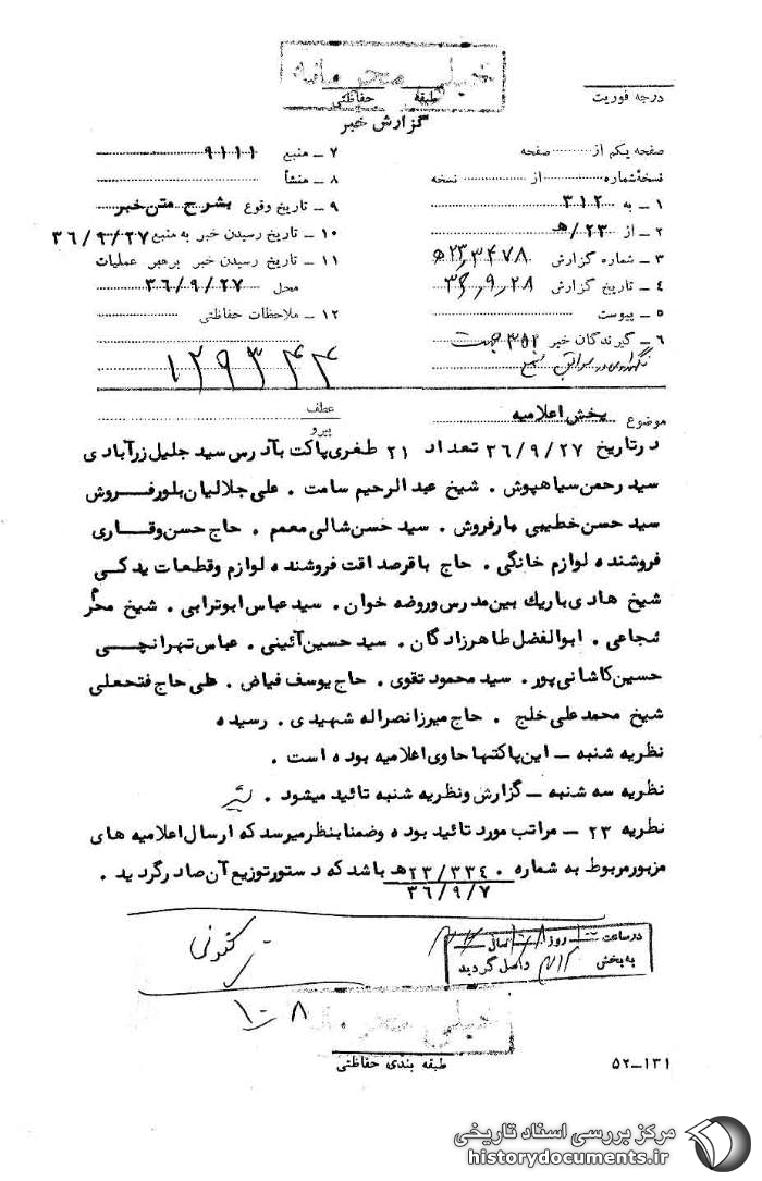 در تاریخ 27 / 9 / 36 تعداد 21 طغری پاکت به آدرس سیدجلیل زرآبادی . سید رحمن سیاهپوش . شیخ عبدالرحیم سامت1. علی جلالیان بلورفروش . سیدحسن خطیبی بارفروش . سیدحسن شالی معمم . حاج حسن وقاری فروشنده لوازم خانگی . حاج باقر صداقت فروشنده لوازم و قطعات یدکی . شیخ هادی باریکبین مدرس و روضهخوان . سیدعباس ابوترابی2 . شیخ محرم شجاعی . ابوالفضل طاهرزادگان . سیدحسین آئینی . عباس تهرانی . حسین کاشانیپور . سیدمحمود تقوی. حاج یوسف فیاض3 . علی حاج فتحعلی . شیخ محمدعلی خلج . حاج میرزانصراله شهیدی رسیده.