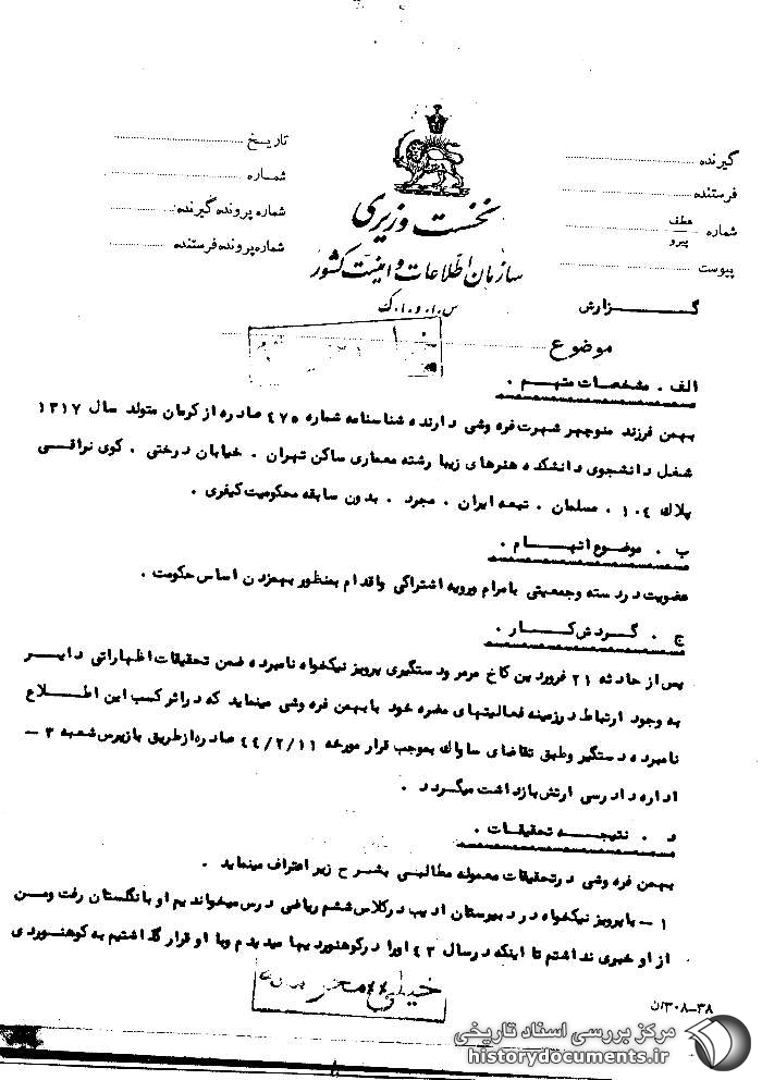 بهمن فرزند منوچهر شهرت فرهوشى دارنده شناسنامه شماره 475 صادره از کرمان متولد سال 1317 شغل دانشجوى دانشکده هنرهاى زیبا رشته معمارى ساکن تهران، خیابان درختى، کوى نراقى، پلاک 14، مسلمان، تبعه ایران، مجرد، بدون سابقه محکومیت کیفرى.