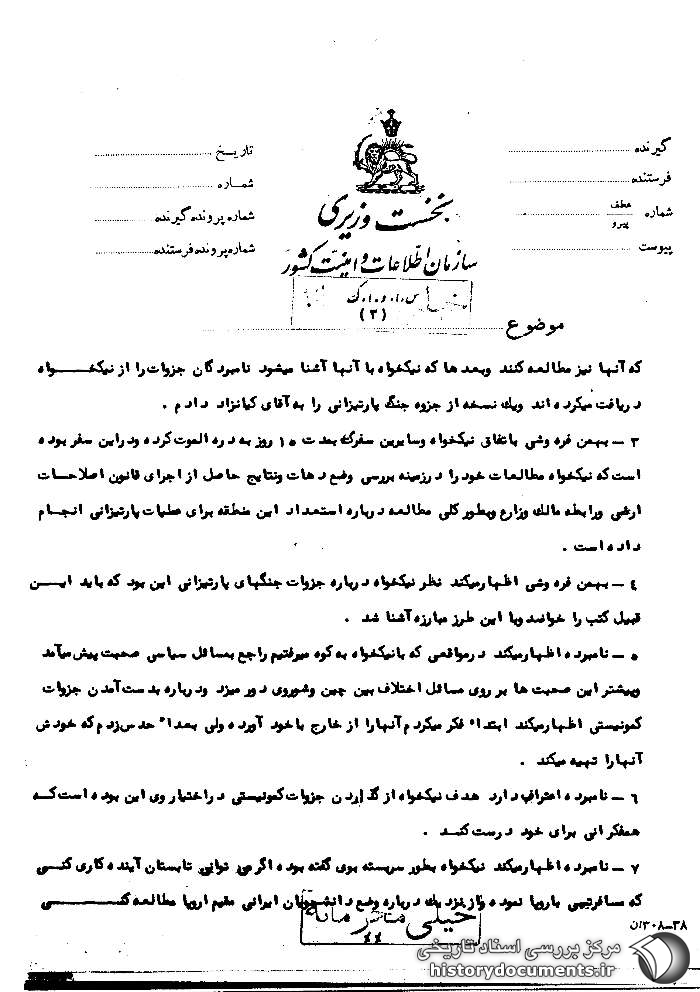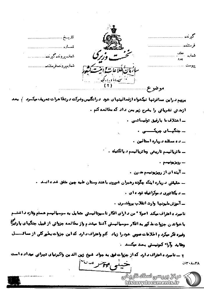 5 ـ نامبرده اظهار میکند در مواقعى که با نیکخواه به کوه میرفتیم راجع به مسائل سیاسى صحبت پیش میآمد و بیشتر این صحبتها بر روى مسائل اختلاف بین چین و شوروى دور میزد و درباره به دست آمدن جزوات کمونیستى اظهار میکند ابتداء فکر میکردم آنها را از خارج با خود آورده ولى بعداً حدس زدم که خودش آنها را تهیه میکند.