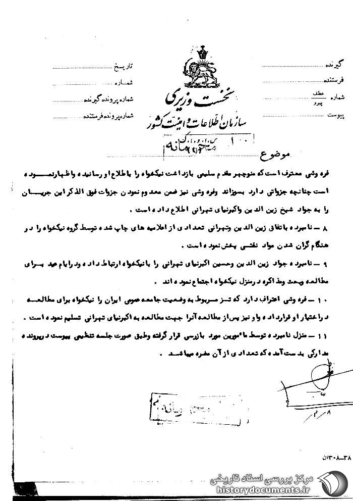 8 ـ نامبرده باتفاق زینالدین و تهرانى تعدادى از اعلامیههاى چاپ شده توسط گروه نیکخواه را در هنگام گران شدن مواد نفتى پخش نموده است.