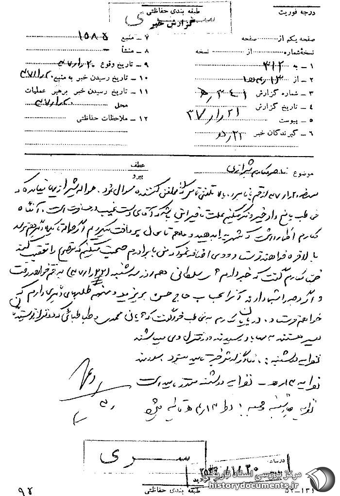 مورخه 20 /1 /37 از قم با نامبرده بالا تلفنی تماس که از تلفنکننده سؤال نمود حواله شیرازیها نیامده که مخاطب پاسخ داد خیر و فکر میکنم علت تأخیر این باشد که آقای دستغیب در مسافرت است. آنگاه مکارم اظهار داشت که شهریه را بدهید و ما هم تا به حال پرداخت میکردیم اگر حواله تا یک ماه دیگر هم نرسد بالاخره خواهند فرستاد و وی اضافه نمود که من با برادرم صحبت میکنم که موضوع را تعقیب کند. ضمناً مکارم گفت که خبر دارم آقای سلطانی هم روز سهشنبه (22 /1 /37) به قم خواهد رفت و اگر وجه را به شما دادند آن را به حساب حاج حسن بریزید و من هم طلبهای دیگری دارم که خواهم فرستاد. در پایان مکارم به مخاطب خود گفت که آقایان محمدی و طباطبایی که دو نفر از نویسندگان تفسیر هستند به مهاباد رسیدند و در منزل وی میباشند.