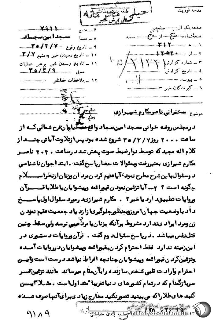 در مجلس روضهخوانی مسجد امین سجاد واقع در خیابان فرح شمالی که از ساعت2000 روز 7 /3 /35 شروع شده بود پس از تلاوتی آیاتی چند از کلاماله مجید که توسط نوار ضبط صوت پخش شد در ساعت 2030 ناصر مکارم شیرازی به منبر رفت و به سؤالات حضار پاسخ گفت. ابتدا جوان ناشناسی دو سئوال به این شرح مطرح نمود. آیا عقیم کردن مردان و زنان از نظر اسلام چگونه است؟ 2. آیا تزئین نمودن قبور ائمه و پیشوایان با طلا با قرآن و روایات تطبیق دارد یا خیر؟