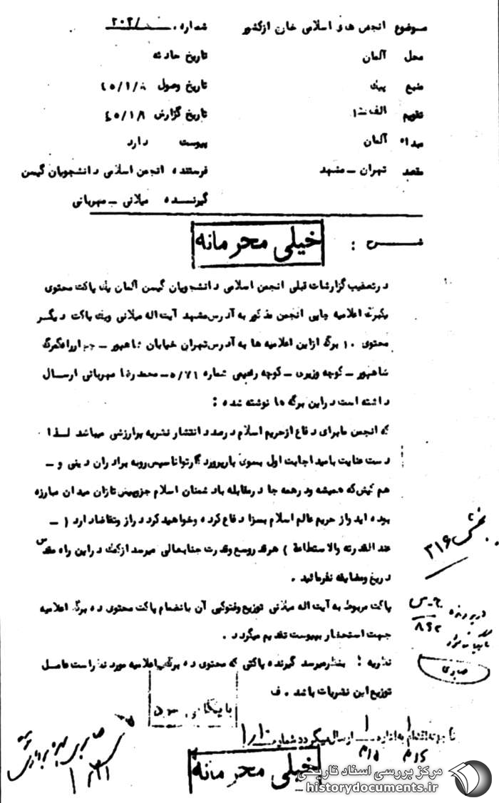 مربوط به آیت الله میلانی توزیع و فتوکپی آن به انضمام پاکت محتوی ده برگ