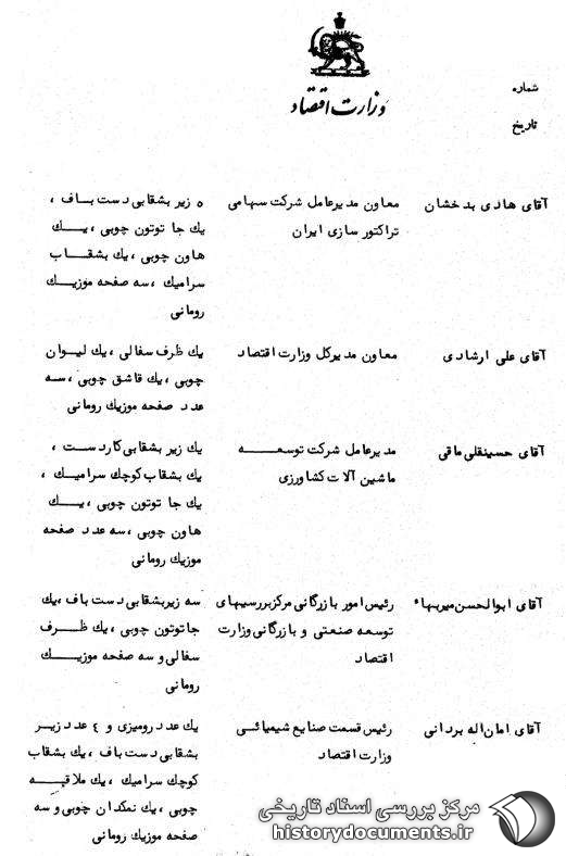 آقای هادی بدخشان معاون مدیر عامل شرکت سهامی تراکتورسازی ایران 5 زیر بشقابی دستباف، یک جا توتون چوبی، یک هاون چوبی، یک بشقاب سرامیک، سه صفحه موزیک رومانی