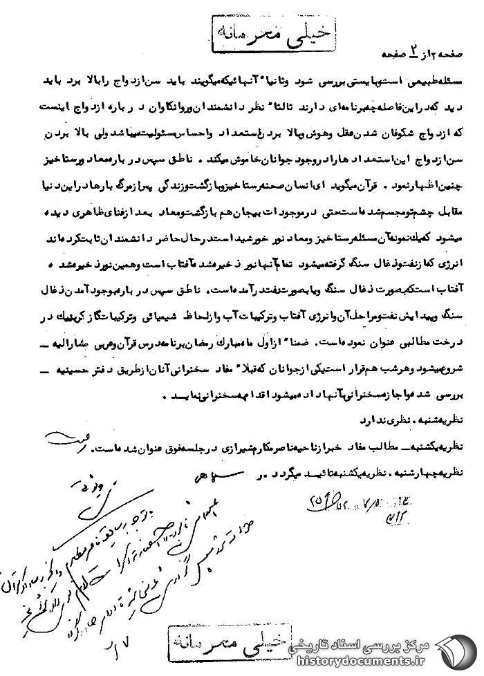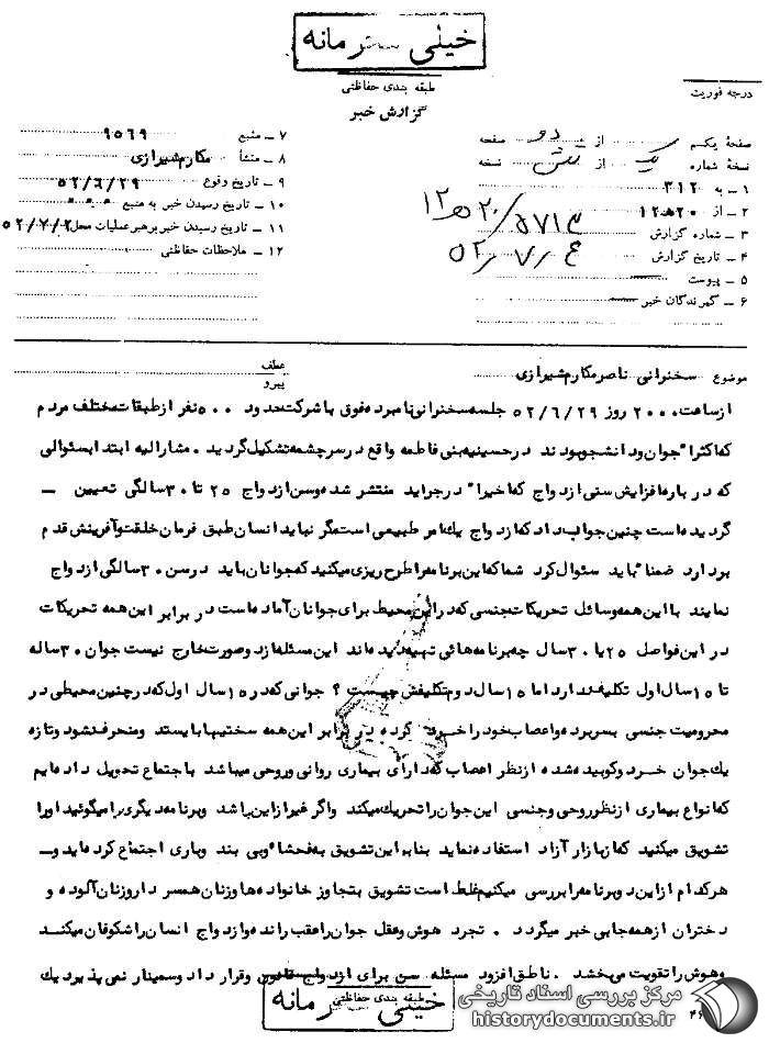 1. ساواک تهران گزارش دیگری نیز از این جلسه، طی شماره 5840 /20 ﻫ 12- 7 /7 /52 تهیه نمود که در ذیل آن نوشته شد: «آقای وثوقی. ناصر مکارم شیرازی باز در منابر خود از سن ازدواج سخن میگوید با توجه به نامه ساواک تهران و اینکه ناصر مکارم شیرازی به تذکرات داده شده وقعی نمیگذارد پاسخ ساواک تهران داده شود. 10 /7 » بخش ضمائم