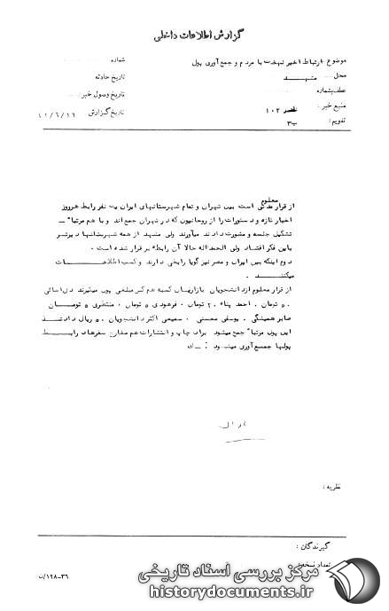 از قرار معلوم مدتی است بین تهران و تمام شهرستانهای ایران یک نفر رابط هر روز اخبار تازه و دستورات را از روحانیون که در تهران جمعاند و با هم مرتباً تشکیل جلسه و مشورت دارند، میآورند ولی مشهد از همه شهرستانها دیرتر به این فکر افتاد ولی الحمدالله حالا آن رابطه برقرار شده است.