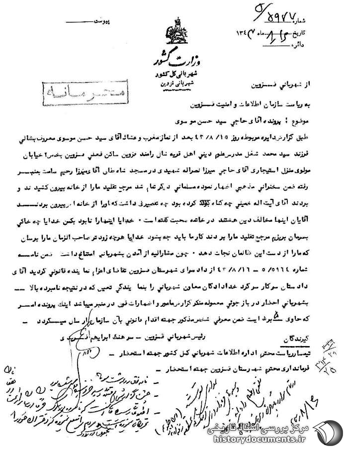 طبق گزارش دایره مربوطه روز 15 / 8 / 43 بعد از نماز مغرب و عشاء آقای سید حسن موسوی معروف به شالی فرزند سید محمد شغل مدرس علوم دینی اهل قریه شال رامند قزوین ساکن فعلی قزوین بخش 2 خیابان مولوی منزل استیجاری آقای حاجی میرزا نصراله شهیدی در مسجد شاه طاق آقای میرزا رحیم سامت به منبر رفته ضمن سخنرانی مذهبی اظهار نموده مسلمانی دیگر تمام شد مرجع تقلید ما را از خانه بیرون کشیدند و بردند آقای آیتاله خمینی چه گناهی کرده بود چه تقصیری داشت که او را از خانهاش بیرون بردند آقایان اینها مخالف دین هستند در خاتمه صحبت گفته است خدایا اینها را نابود بکن خدایا چه خاکی به سرمان بریزیم مرجع تقلید ما را بردند کار ما باید چه بشود. خدایا هر چه زودتر صاحبالزمان ما را برسان که ما را از دست این ظالمان نجات دهد. چون مشارالیه از آمدن به شهربانی امتناع داشت ضمن نامه شماره 5964 / 5 ـ 16 / 8 / 43 از دادسرای شهرستان قزوین تقاضای اعزام نماینده قانونی گردید آقای دادستان سرکار سرگرد خدادادگان معاون شهربانی را به نمایندگی تعیین که در نتیجه نامبرده بالا به شهربانی احضار در بازجوئی معموله منکر گزارش مامور و اظهارات فوق در منبر میباشد اینک پرونده امر که حاوی 5 برگ است ضمن معرفی شخص مذکور جهت اقدام قانونی به آن سازمان ارسال میگردد.