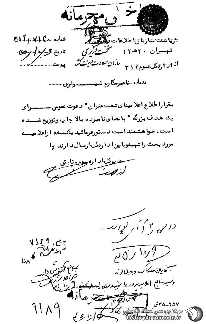 به قرار اطلاع اعلامیهای تحت عنوان «دعوت عمومی برای یک هدف بزرگ1» به امضای نامبرده بالا چاپ و توزیع شده است. خواهشمند است دستور فرمایید یک نسخه از اعلامیه مورد بحث را تهیه و به این اداره کل ارسال دارند.