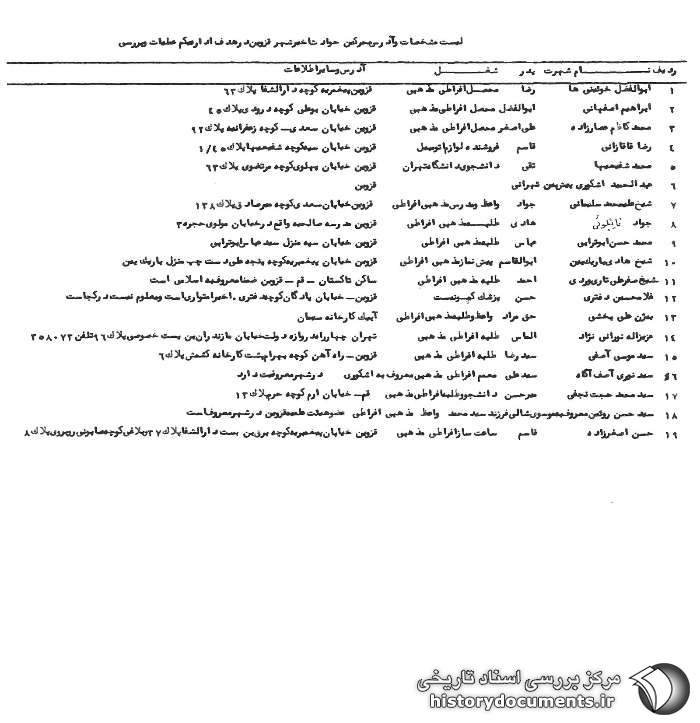 2. ابراهیم اصفهانی ـ ابوالفضل ـ محصل افراطی مذهبی ـ قزوین خیابان بوعلی کوچه درودی پلاک 45 3. محمدکاظم عمارزاده ـ علیاصغرـ محصل افراطی مذهبی ـ قزوین خیابان سعدی کوچه زعفرانیه پلاک 92