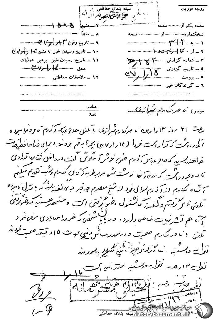 ساعت 21 روز 13 /1 /37 ناصر مکارم شیرازی با تلفن حاج عباس آزرم تماس و به نامبرده اظهار داشت که قرار است فردا (14 /1 /37) بچهها به قم بروند و برای خداحافظی خدمت خواهند رسید که حاج عباس آزرم ضمن خوشآمدگویی گفت در داخل کتابها تعدادی نامه وجود داشت که روی آنها نوشته شده مربوط به آقای مکارم و شب تقدیم میکنم. آنگاه مکارم از آزرم1 سئوال نمود از شیخ معصوم چه خبر. به وی گفته شد که با منزل نامبرده تلفنی تماس گرفتم و گفتند که مشغول وضو گرفتن است و مستحضر هستید که وضو گرفتن آقا هم تشریفات خاصی دارد. در پایان شخصی که خود را مهابادی معرفی نمود تلفنی با ناصر مکارم صحبت و در مورد مسائل دینی به مدت 15 دقیقه صحبت نمودند.