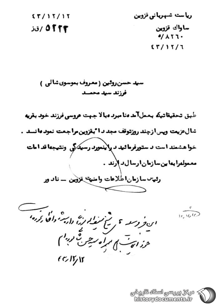 طبق تحقیقاتی که به عمل آمده نامبرده بالا جهت عروسی فرزند خود به قریه شال عزیمت و پس از چند روز توقف مجدداً به قزوین مراجعت نمودهاند. خواهشمند است دستور فرمایید در این مورد رسیدگی و نتیجه اقدامات معموله را به این سازمان ارسال دارند.