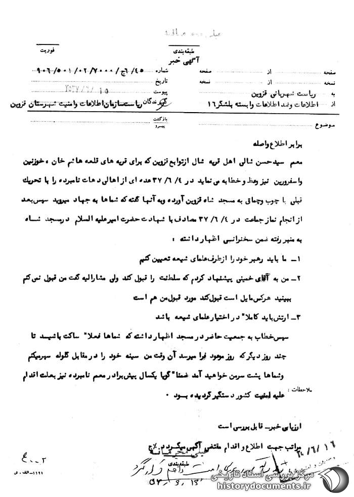 معمم سیدحسن شالی اهل قریه شال از توابع قزوین که برای قریههای قلعه هاشمخان،1 خوزنین2 و اسفرورین نیز وعظ و خطابه مینماید در 4 / 6 / ۳۷ عدهای از اهالی دهات نامبرده را با تحریک قبلی با چوب و چماق به مسجد شاه قزوین آورده و به آنها گفته که شماها به جهاد میروید سپس بعد از انجام نماز جماعت در ۴ / ۶ / ۳۷ مصادف با شهادت حضرت امیر علیهالسلام در مسجد شاه به منبر رفته ضمن سخنرانی اظهار داشته: