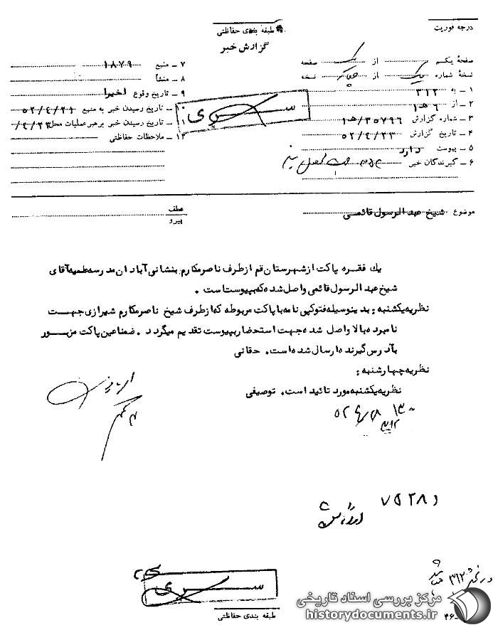 یک فقره پاکت از شهرستان قم از طرف ناصر مکارم به نشانی آبادان مدرسه علمیه آقای شیخ عبدالرسول قائمی واصل شده که به پیوست1 است.