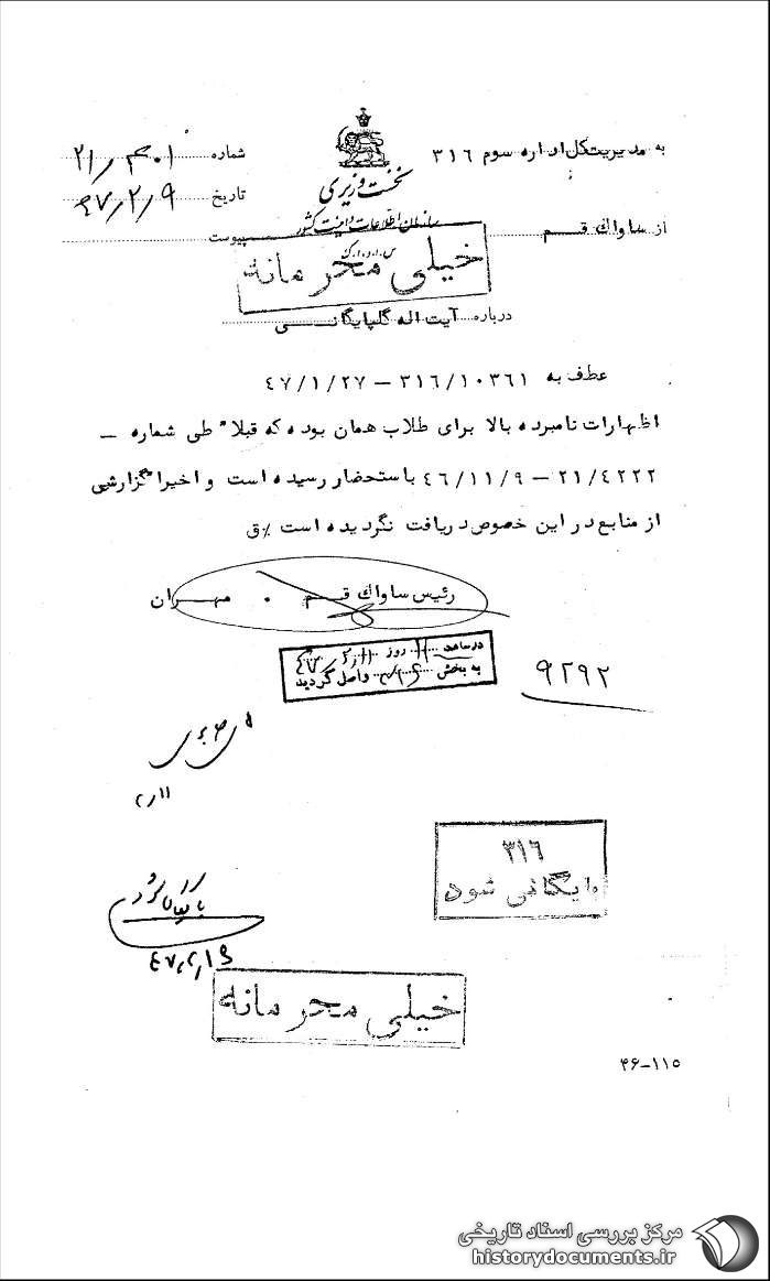 درباره : آیت اله گلپایگانی عطف به 10361/316 ـ 27/1/47