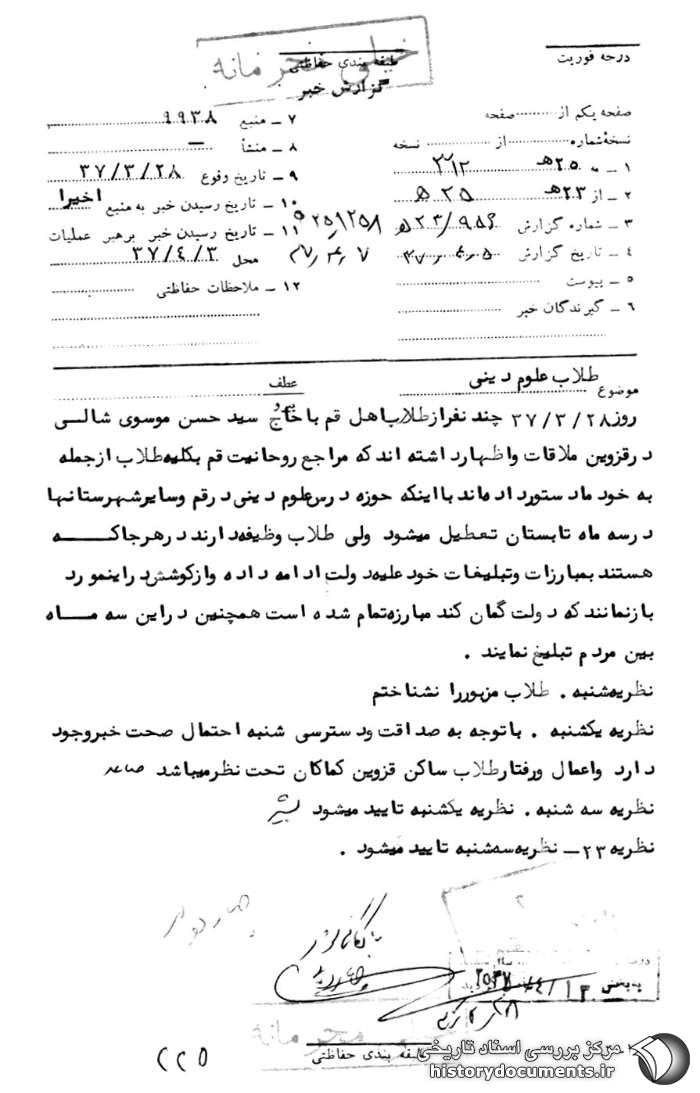 روز ۲۸ / ۳ / ۳۷ چند نفر از طلاب اهل قم با حاج سیدحسن موسوی شالی در قزوین ملاقات و اظهار داشتهاند که مراجع روحانیت قم به کلیه طلاب از جمله به خود ما دستور دادهاند با اینکه حوزه درس علوم دینی در قم و سایر شهرستانها در سه ماه تابستان تعطیل میشود ولی طلاب وظیفه دارند در هر جا که هستند به مبارزات و تبلیغات خود علیه دولت ادامه داده و از کوشش در این مورد باز نمانند که دولت گمان کند مبارزه تمام شده است همچنین در این سه ماه بین مردم تبلیغ نمایند.