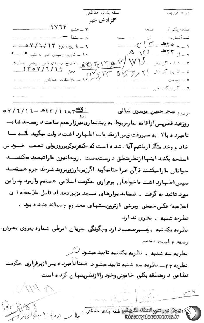 روز عید فطر پس از اقامه نماز مربوطه به پیشنمازی میرزا رحیم سامت در مسجد شاه نامبرده بالا به منبر رفت و پس از مقدمات اظهار داشت دولت میگوید که ما خادم و خدمتگزار ملتیم آیا شده است که یک نفر نوکر بر روی ولی نعمت خودش اسلحه بکشد اینها از نظر منطق درست نیست روحانیون ما را تبعید میکنند جوانان ما را میکشند قرآن صراحتاً میگوید اگر زیر بار زور بروید شریک جرم هستید سپس اظهار داشت ما خواهان برقراری حکومت اسلامی هستیم و از مردم در این مورد تایید گرفت ضمناً به دیوارهای مسجد مزبور تعداد قابل ملاحظهای اعلامیه، عکس خمینی و برخی از تروریستهای معدوم چسبانده شده بود.