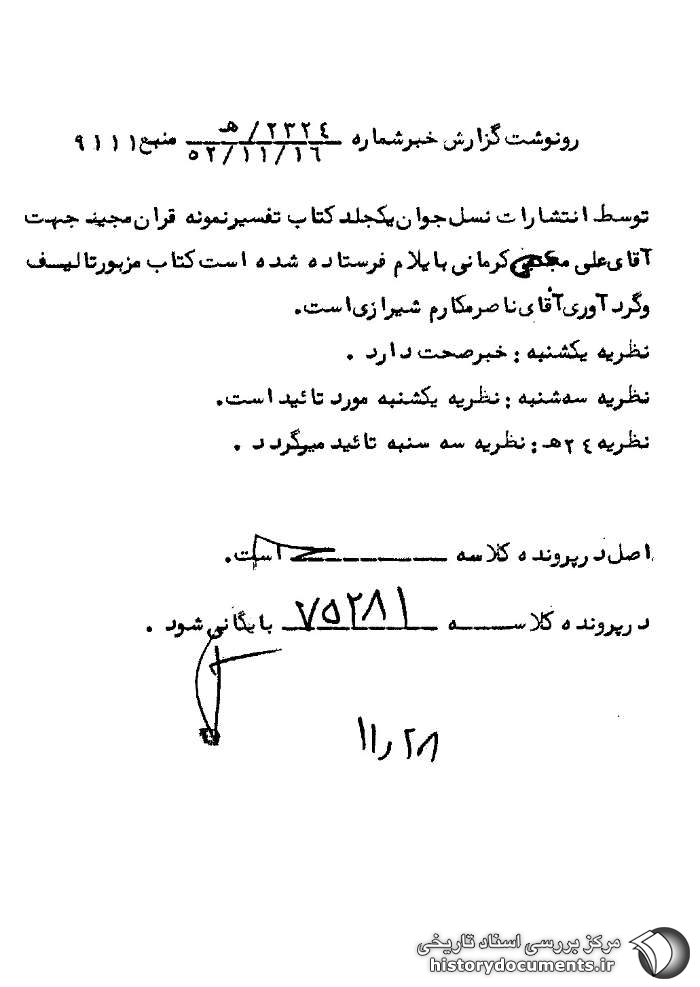 توسط انتشارات نسل جوان یک جلد کتاب تفسیر نمونه1 قرآن مجید جهت آقای علی حجتی کرمانی2 به ایلام فرستاده شده است. کتاب مزبور تألیف و گردآوری آقای ناصر مکارم شیرازی است.