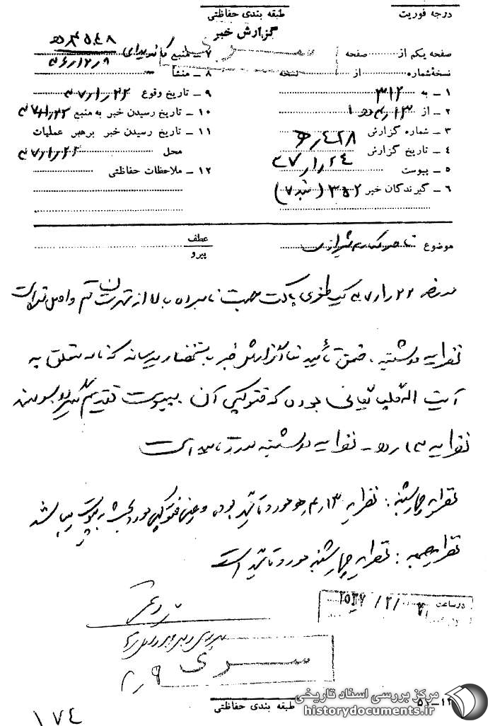 نظریه دوشنبه. ضمن تأیید مفاد گزارش خبر به استحضار میرساند که نامه متعلق به آیتاله گلپایگانی بوده که فتوکپی آن به پیوست1 تقدیم میگردد.
