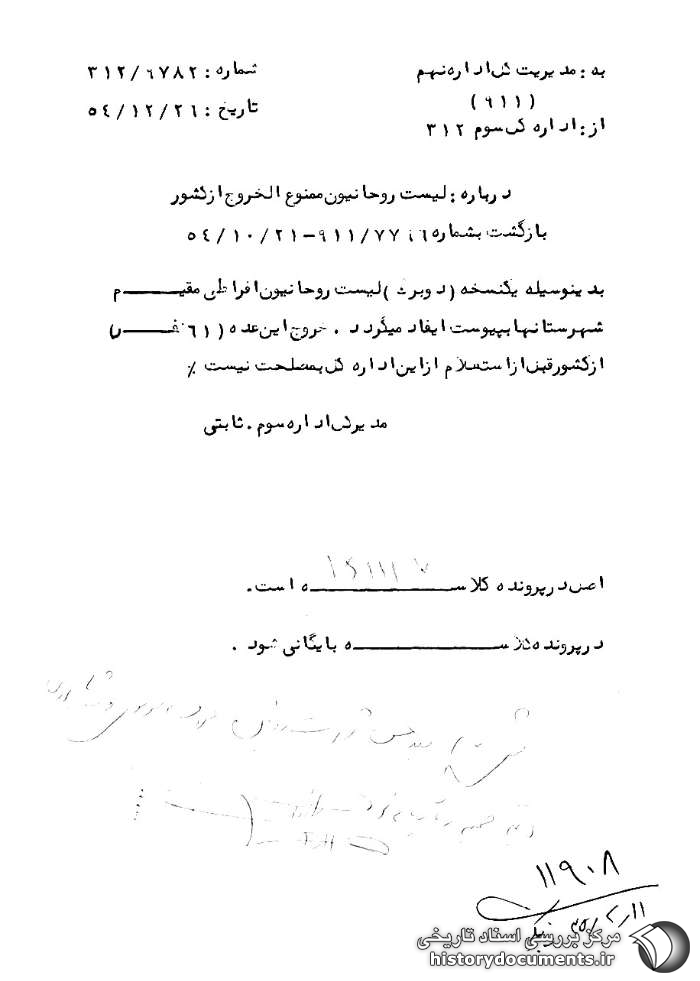بدینوسیله یک نسخه (دو برگ) لیست روحانیون افراطی مقیم شهرستانها به پیوست ایفاد میگردد. خروج این عده (٦١ نفر) ازکشور قبل از استعلام از این اداره کل به مصلحت نیست.1