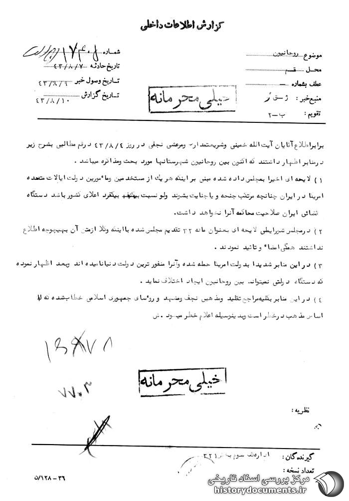 برابر اطلاع آقایان آیتاله خمینی و شریعتمداری1 و مرعشی نجفی2 در روز 4 / 8 / 43 در قم مطالبی به شرح زیر در منابر اظهار داشتند که اکنون بین روحانیون شهرستانها مورد بحث و مذاکره میباشد.