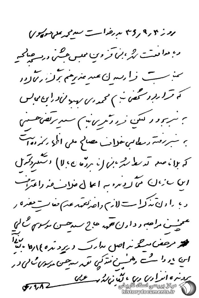 روز 3 / 9 / 36 به درخواست سیدمحمدعلی موسوی و با موافقت شهربانی قزوین مجلس جشنی در مسجد صالحیه1 به مناسبت فرارسیدن عید غدیرخم برگزار میگردد که قرار بود شخصی به نام محمودی بهبهانی2 در این مجالس به منبر برود لیکن فرد دیگری به نام سیدمرتضی حسینی3 به منبر رفته و مطالبی خلاف مصالح ملی اظهار نموده است که بلافاصله توسط شهربانی (نامبردگان بالا) دستگیر و تحویل این سازمان میگردند و به اعمال خلاف خود اعتراف و با دادن تذکرات لازم و اخذ تعهد عدم فعالیت مضره و همچنین مراجعه و دادن تعهد حاج سیدحسن موسوی شالی مرخص میشوند4 اصل مدارک در پرونده 14 / 15 بایگانی است این یادداشت و همچنین فتوکپی تعهد سیدحسن موسوی شالی در پرونده انفرادی وی بایگانی شد. عربی