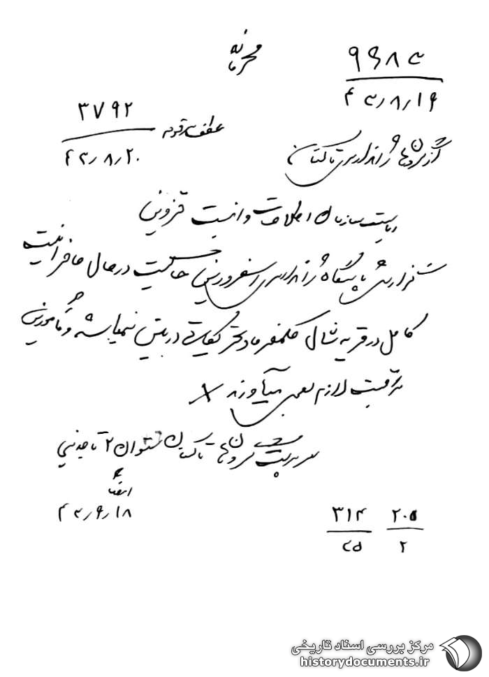 عطف به مرقومه 3792 ـ 20 / 8 / 43