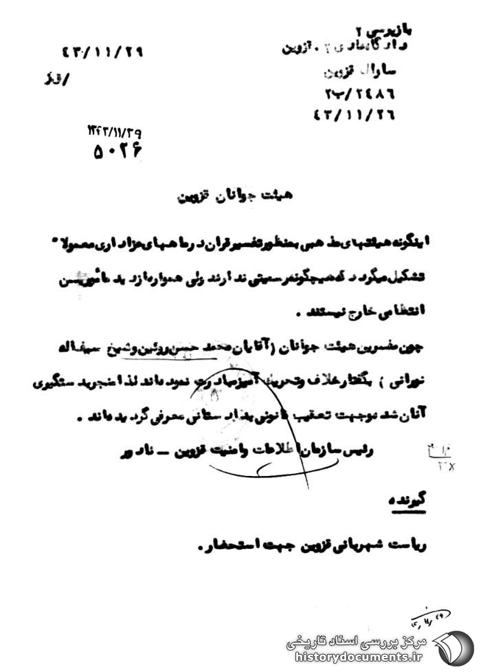 چون مفسرین هیئت جوانان (آقایان محمد حسن روئین و شیخ سیفاله نورانی) به گفتار خلاف و تحریکآمیز مبادرت نمودهاند لذا منجر به دستگیری آنان شده و جهت تعقیب قانونی به دادستانی معرفی گردیدهاند.