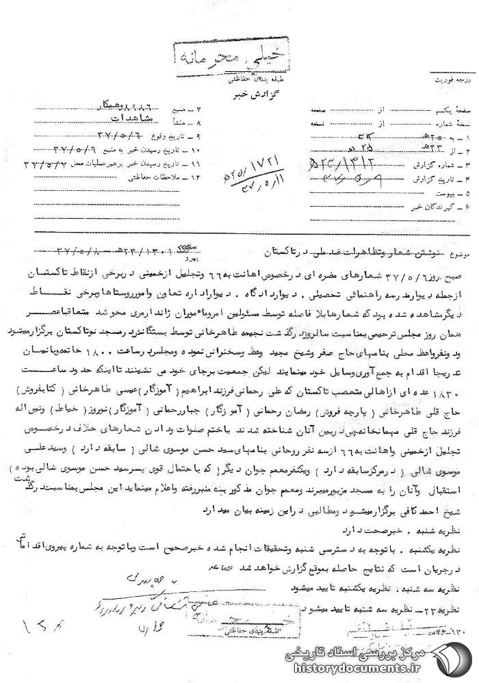 صبح روز 6 / 5 / 37 شعارهای مضرهای در خصوص اهانت به 66 و تجلیل از خمینی در برخی از نقاط تاکستان از جمله دیوار مدرسه راهنمائی تحصیلی. دیوار دادگاه، دیوار اداره تعاون و امور روستاها و برخی نقاط دیگر مشاهده شده بود که شعارها بلافاصله توسط مسئولین امر و مأموران ژاندارمری محو شد متعاقباً عصر همان روز مجلس ترحیمی به مناسبت سالروز در گذشت نجمه طاهرخانی توسط بستگانش در مسجد نو تاکستان برگزار میشود و دو نفر واعظ محلی بنامهای حاج صفر و شیخ مجید وعظ و سخنرانی نموده و مجلس در ساعت 1800 خاتمه و بانیان تدریجاً اقدام به جمعآوری وسایل خود مینمایند لیکن جمعیت بر جای خود مینشیند تا اینکه حدود ساعت 1830 عدهای از اهالی متعصب تاکستان که علی رحمانی فرزند ابراهیم (آموزگار) عیسی طاهرخانی (کتابفروش) حاج قلی طاهرخانی (پارچه فروش) رمضان رحمانی (آموزگار) جبار رحمانی1 (آموزگار) نوروز (خیاط) و نبیاله فرزند حاج قلی مهمانخانهچی در بین آنان شناخته شدند با ختم صلوات و دادن شعارهای خلاف درخصوص تجلیل از خمینی و اهانت به 66 از سه نفر روحانی به نامهای سیدحسن موسوی شالی (سابقه دارد) و سیدعلی موسوی شالی (در مرکز سابقه دارد) و یک نفر معمم جوان دیگر (که به احتمال قوی پسر سیدحسن موسوی شالی بوده) استقبال و آنان را به مسجد مزبور میبرند و معمم جوان مذکور به منبر رفته و اعلام مینماید این مجلس به مناسبت درگذشت شیخ احمد کافی برگزار میشود و مطالبی در این زمینه بیان میدارد.