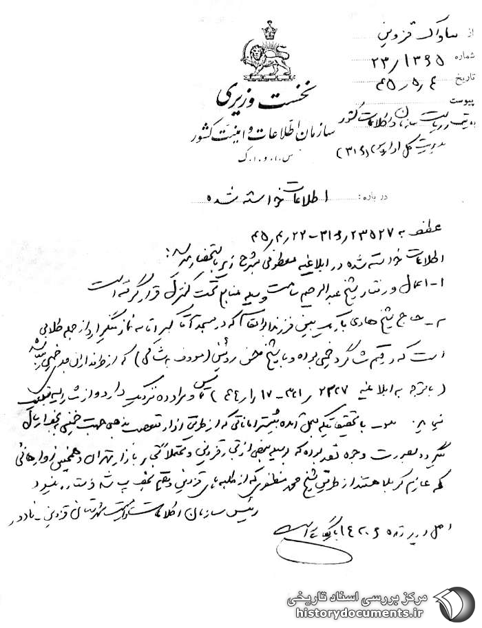 3ـ با تحقیقاتی که به عمل آمده بیشتر اماناتی که از طریق افراد متعصب مذهبی جهت خمینی به نجف ارسال میگردد به صورت وجوه نقد بوده که به وسیله بعضی از تجار قزوینی و محتملاً تجار بازار تهران و همچنین زواری که عازم کربلا هستند از طریق شیخ محمد مظفری2 که از طلبههای قزوین و قم و نجف میباشد فرستاده میشود.