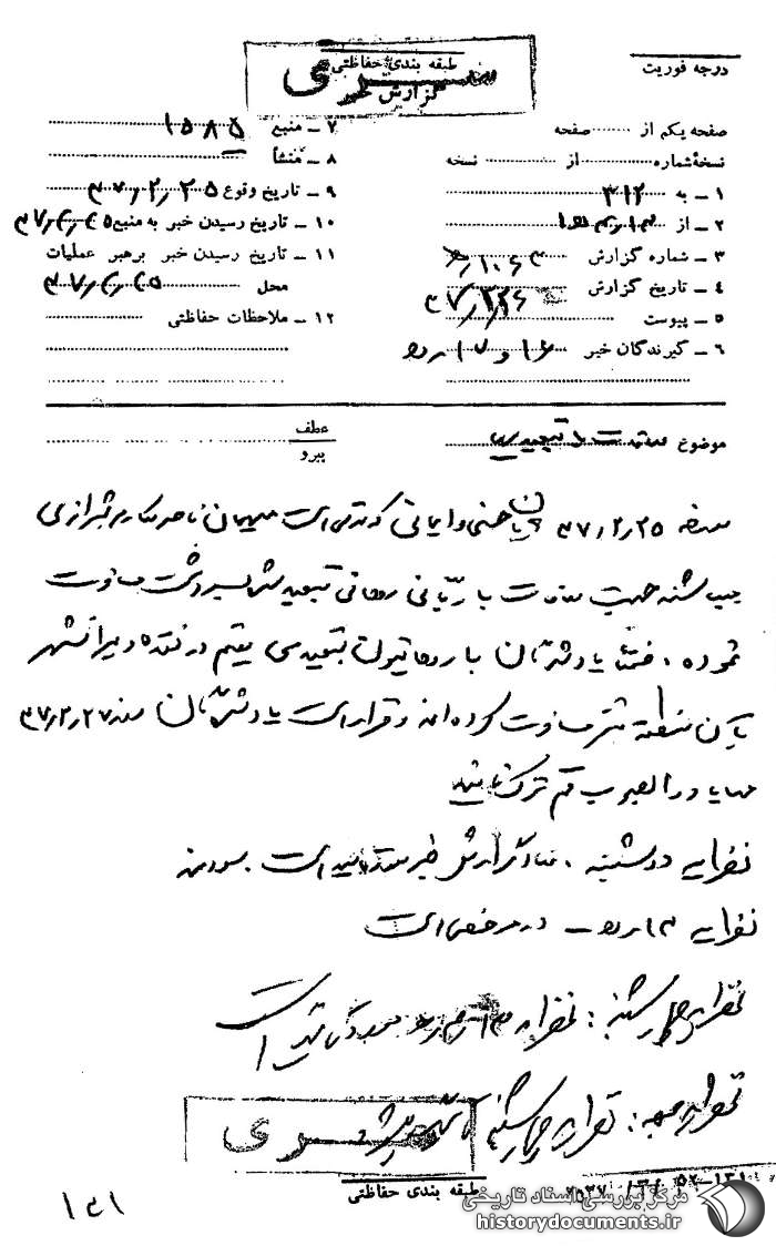 مورخه 25 /2 /37 آقایان حسنی و ایمانی که مدتی است میهمان ناصر مکارم شیرازی میباشند جهت ملاقات با ربانی روحانی تبعیدشده به سردشت مسافرت نموده. ضمناً یادشدگان با روحانیون تبعیدی مقیم در نقده و پیرانشهر به آن منطقه نیز مسافرت کردهاند و قرار است یادشدگان روز 27 /2 /37 مهاباد را به صوب قم ترک نمایند.