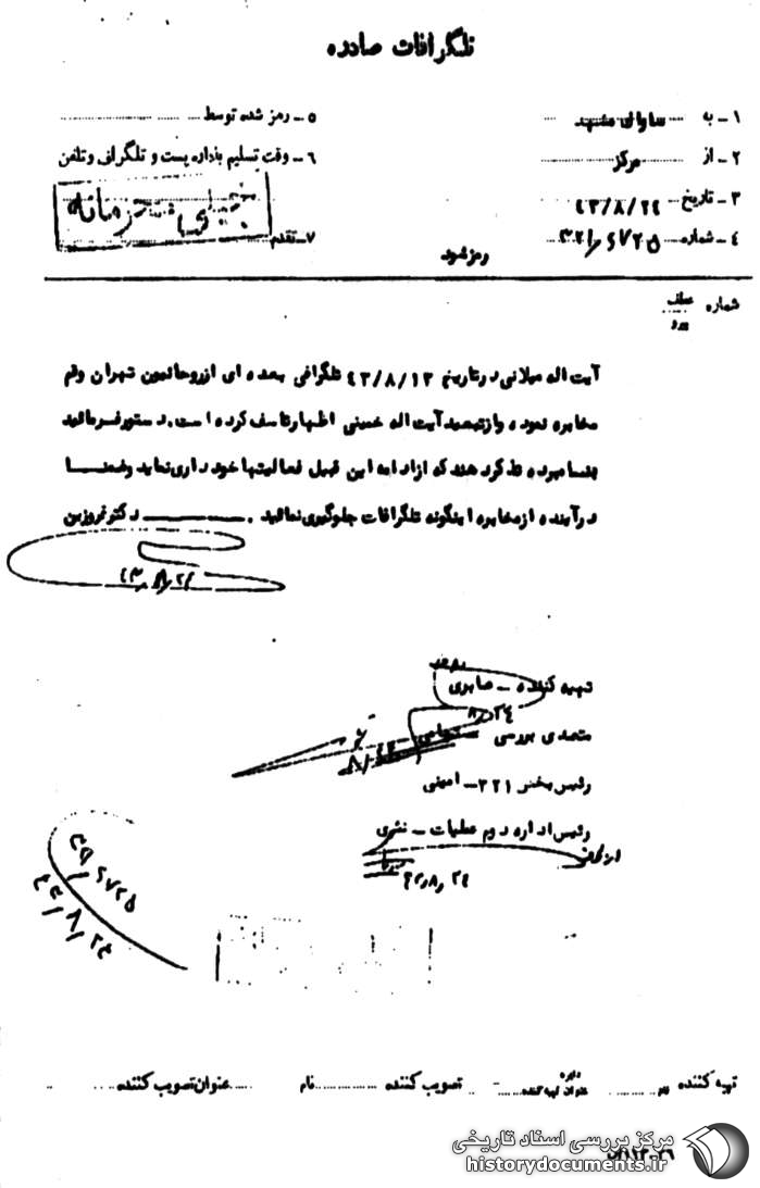 ضمنا در آینده از مخابره این گونه تلگرافات جلوگیری نمائید.