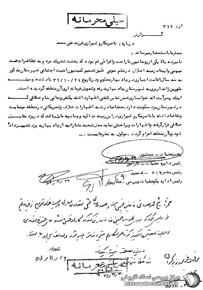 اینک پسر آیتاله خوانساری ضمن تماس تلفنی اظهار داشته یک نفر روحانی به نام صدوقی که در شهرستان یزد سکونت دارد بعضاً مبادرت به اظهارات خلاف و تحریکاتی در منطقه مینماید و تقاضا داشته با ناصر مکارم شیرازی در این زمینه مذاکره و چنانچه مایل باشد که در یزد مقابل صدوقی قرار گرفته و اظهارات وی را خنثی نماید محل تبعید مشارالیه از چاهبهار به یزد تغییر داده شود و به آن منطقه اعزام گردد. موکول به نظر عالیست.