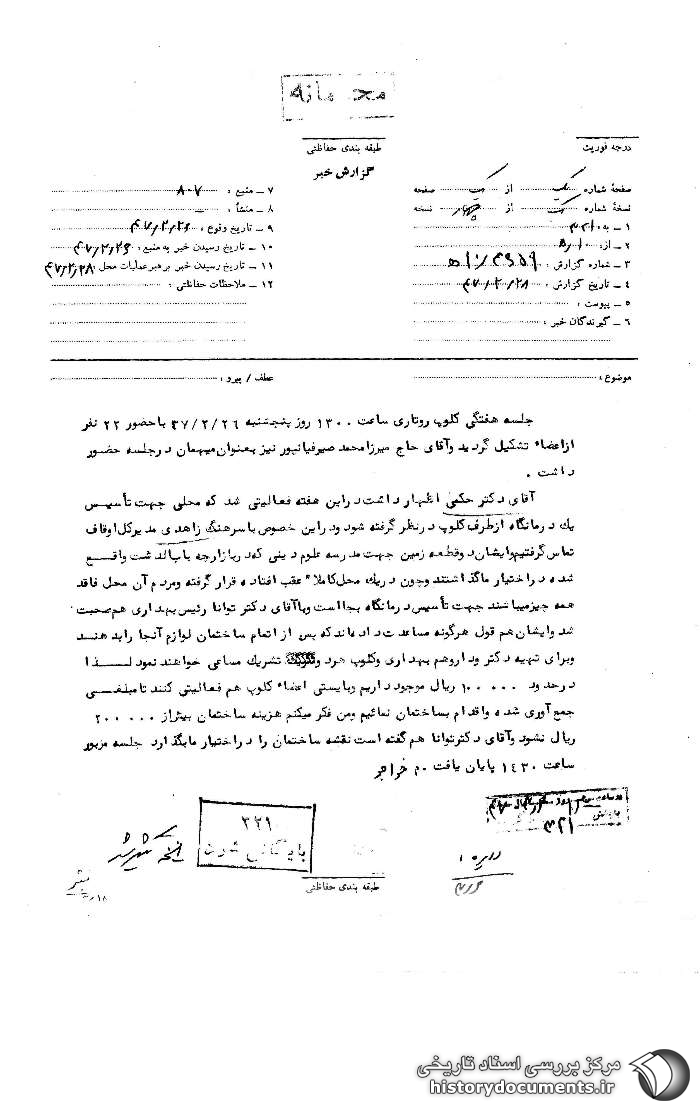 آقای دکتر حکمی اظهار داشت در این هفته فعالیتی شد که محلی جهت تأسیس یک درمانگاه از طرف کلوپ در نظر گرفته شود و در این خصوص با سرهنگ زاهدی مدیر کل اوقاف تماس گرفتیم و ایشان دو قطعه زمین جهت مدرسه علوم دینی که در بازارچه بابالدشت واقع شده در اختیار ما گذاشتند و چون در یک محل کاملاً عقبافتاده قرار گرفته و مردم آن محل فاقد همه چیز میباشند جهت تأسیس درمانگاه بجا است و با آقای دکتر توانا رئیس بهداری هم صحبت شد و ایشان هم قول هرگونه مساعدت دادهاند که پس از اتمام ساختمان لوازم آنجا را بدهند و برای تهیه دکتر و دارو هم بهداری و کلوپ هر تشریک مساعی خواهند نمود لذا در حدود 100000 ریال موجود داریم و بایستی اعضاء کلوپ هم فعالیتی کنند تا مبلغی جمعآوری شده و اقدام به ساختمان نمائیم و من فکر میکنم هزینه ساختمان بیش از 200000 ریال نشود و آقای دکتر توانا هم گفته است نقشه ساختمان را در اختیار ما بگذارد جلسه مزبور ساعت 1430 پایان یافت.