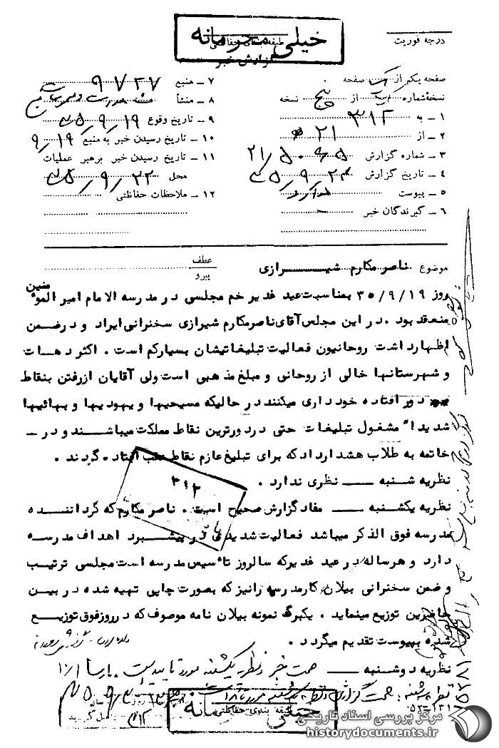 روز 19 /9 /35 به مناسبت عید غدیر خم مجلسی در مدرسه الامام امیرالمؤمنین منعقد بود. در این مجلس آقای ناصر مکارم شیرازی سخنرانی ایراد و در ضمن اظهار داشت روحانیان فعالیت تبلیغاتیشان بسیار کم است. اکثر دهات و شهرستانها خالی از روحانی و مبلغ مذهبی است ولی آقایان از رفتن به نقاط دورافتاده خودداری میکنند در حالی که مسیحیها و یهودیها و بهاییها شدیداً مشغول تبلیغات حتی در دورترین نقاط مملکت میباشند و در خاتمه به طلاب هشدار داد که برای تبلیغ عازم نقاط عقبافتاده گردند.