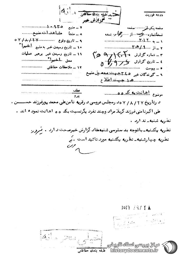 در تاریخ 27 /8 /57 در مجلس عروسی در قریه نامن، علی محمدپور فرزند حسن . علی اکبر نامنی فرزند کربلامراد و چند نفر دیگر نسبت به کد 155 اهانت نمودهاند.