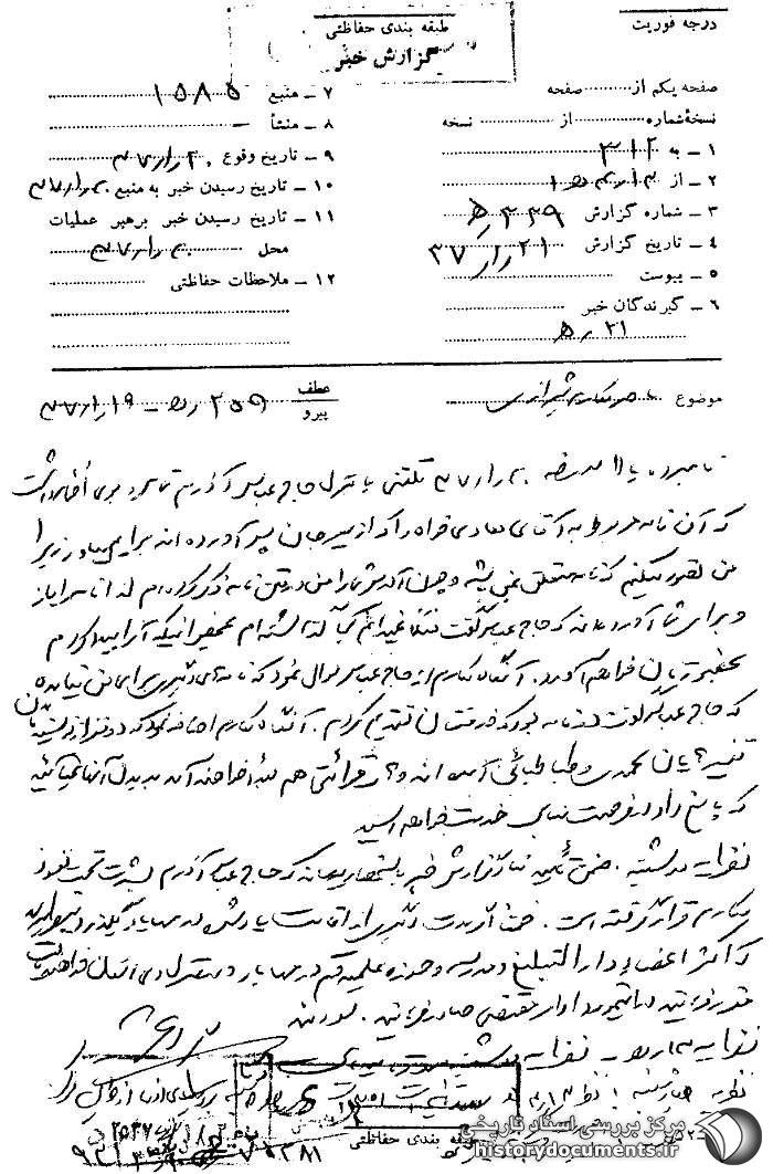 نظریه دوشنبه. ضمن تأیید مفاد گزارش خبر به استحضار میرساند که حاج عباس آزرم به شدت تحت نفوذ مکارم قرار گرفته است. ضمناً اگر مدت دیگری از اقامت یادشده در مهاباد بگذرد به نظر میرسد که اکثر اعضاء دارالتبلیغ و مدرسه و حوزه علمیه قم در مهاباد و در منزل وی اسکان خواهند یافت. مقرر فرمایید در این مورد اوامر مقتضی صادر فرمایند.
