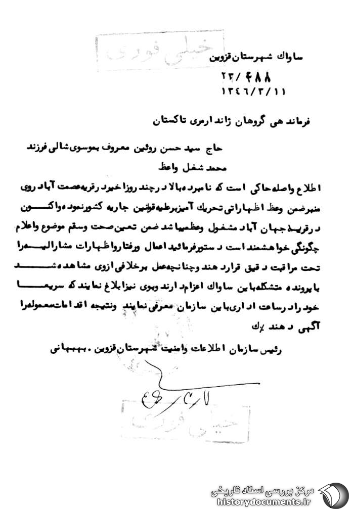 اطلاع واصله حاکی است که نامبرده بالا در چند روز اخیر در قریه عصمتآباد روی منبر ضمن وعظ اظهاراتی تحریکآمیز بر علیه قوانین جاریه کشور نموده و اکنون در قریه جهانآباد1 مشغول وعظ میباشد ضمن تعیین صحت و سقم موضوع و اعلام چگونگی خواهشمند است دستور فرمایید اعمال و رفتار و اظهارات مشارالیه را تحت مراقبت دقیق قرار دهند و چنانچه عمل بر خلافی از وی مشاهده شد با پرونده متشکله به این ساواک اعزام دارند و به وی نیز ابلاغ نمایند که سریعاً خود را در ساعت اداری به این سازمان معرفی نمایند و نتیجه اقدامات معموله را آگهی دهند. ک