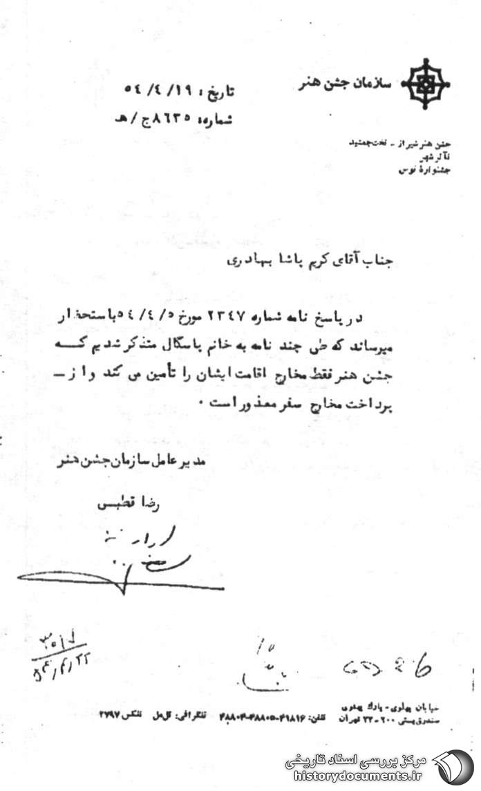 در پاسخ نامه شماره 2347 مورخ 5 /4 /54 به استحضار مىرساند که طى چند نامه به خانم پاسکال متذکر شدیم که جشن هنر فقط مخارج اقامت ایشان را تأمین مىکند و از پرداخت مخارج سفر معذور است.