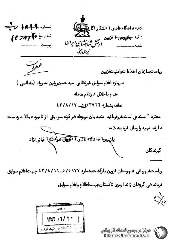 ریاست شهربانی شهرستان قزوین بازگشت به شماره 5977 / 5 ـ 16 / 8 / 43 جهت اعلام سوابق فرماندهی گروهان ژاندارمری تاکستان جهت اطلاع و اعلام سوابق