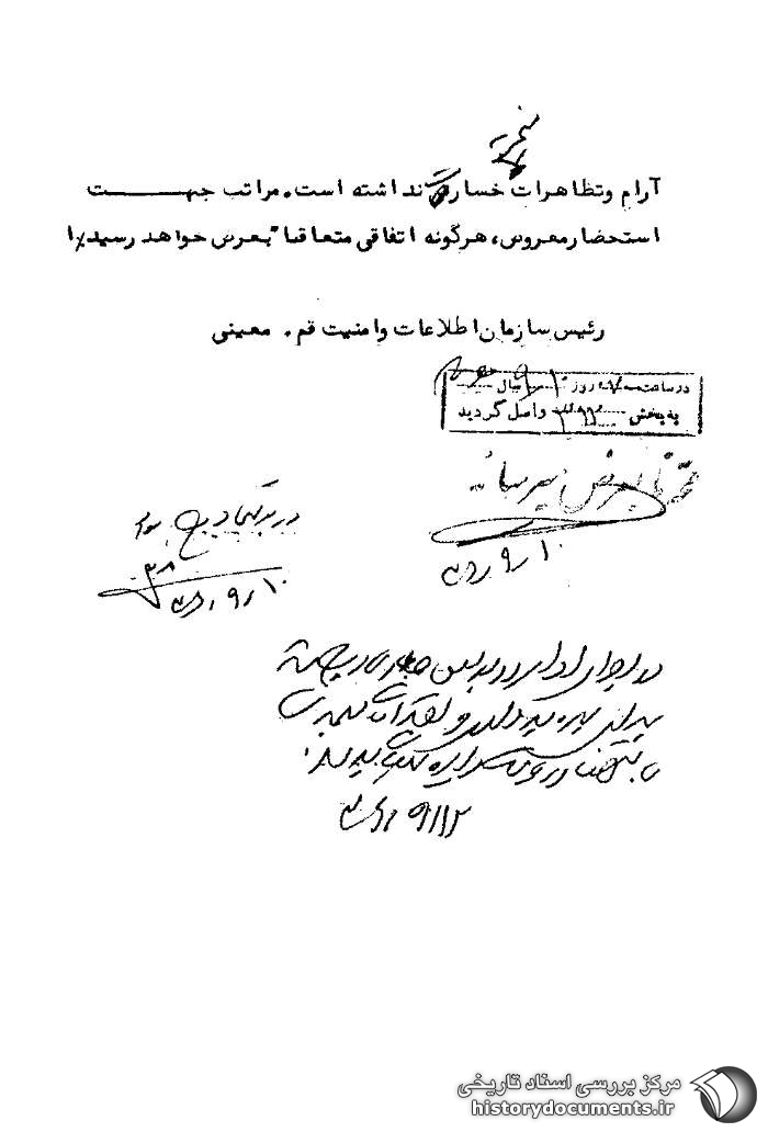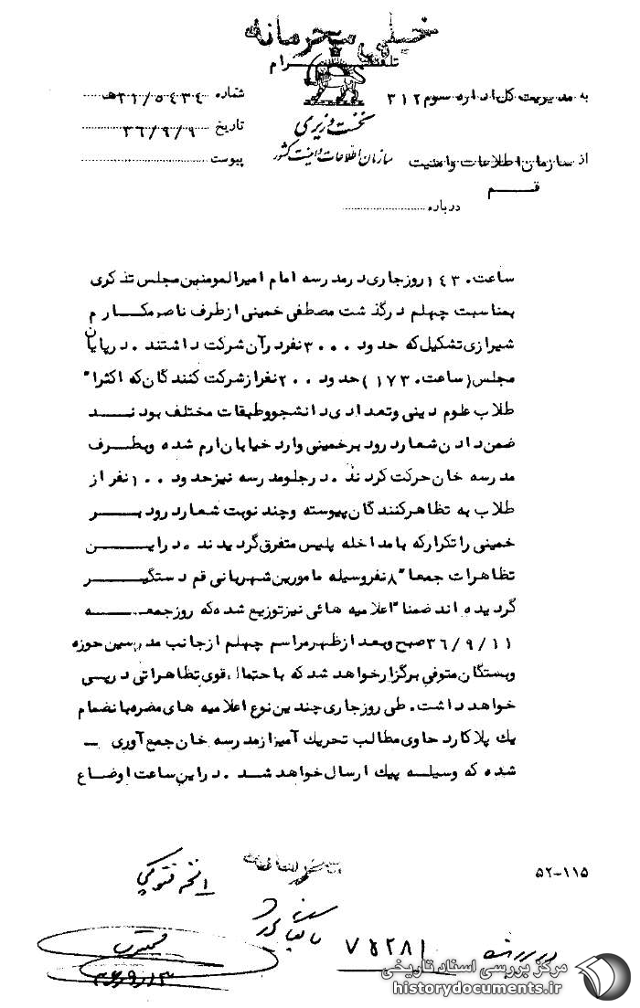ساعت 1430 روز جاری در مدرسه امام امیرالمؤمنین مجلس تذکری به مناسبت چهلم درگذشت مصطفی خمینی از طرف ناصر مکارم شیرازی تشکیل، که حدود 3000 نفر در آن شرکت داشتند. در پایان مجلس (ساعت 1730) حدود 200 نفر از شرکتکنندگان که اکثراً طلاب علوم دینی و تعدادی دانشجو و طبقات مختلف بودند، ضمن دادن شعار درود بر خمینی وارد خیابان ارم شده و به طرف مدرسه خان حرکت کردند. در جلوی مدرسه نیز حدود 100 نفر از طلاب به تظاهرکنندگان پیوسته و چند نوبت شعار درود بر خمینی را تکرار که با مداخله پلیس متفرق گردیدند. در این تظاهرات جمعاً 8 نفر وسیله مأمورین شهربانی قم دستگیر گردیدهاند. ضمناً اعلامیههایی نیز توزیع شده که روز جمعه 11 /9 /36 صبح و بعدازظهر مراسم چهلم از جانب مدرسین حوزه و بستگان متوفی برگزار خواهد شد که به احتمال قوی تظاهراتی در پی خواهد داشت. طی روز جاری چندین نوع اعلامیههای مضره به انضمام یک پلاکارد حاوی مطالب تحریکآمیز از مدرسه خان جمعآوری شده که وسیله پیک ارسال خواهد شد. در این ساعت اوضاع آرام و تظاهرات منجر به خسارت نداشته است. مراتب جهت استحضار معروض، هرگونه اتفاقی متعاقباً به عرض خواهد رسید.