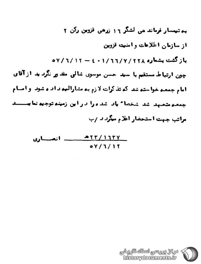 چون ارتباط مستقیم با سیدحسن موسوی شالی مقدور نگردید از آقای امام جمعه خواسته شد که تذکرات لازم به مشارالیه داده شود و امام جمعه متعهد شد شخصاً یاد شده را در این زمینه توجیه نماید مراتب جهت استحضار اعلام میگردد.