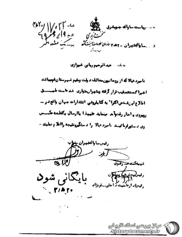 از : ساواک تهران 20 ه 3 شماره : 17022 /20 ه 3
