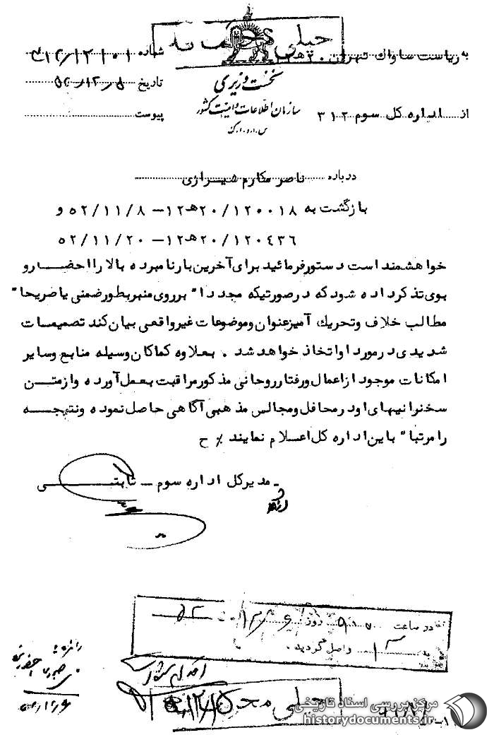 1. بر اساس این دستور، ساواک تهران، ضمن ارسال یک نسخه از گزارش 120018/ﻫ12- 8 /11 /52 برای ساواک جنوب شرق، طی شماره 121331/ﻫ12- 16 /12 /52، دستور احضار آیتالله مکارم را صادر نمود و نوشت: «ضمناً یک نسخه بیوگرافی ملصق به عکسش را که در آن نشانی دقیق محل سکونت یادشده در تهران درج شده باشد، تهیه و ارسال دارند.» بخش ضمائم