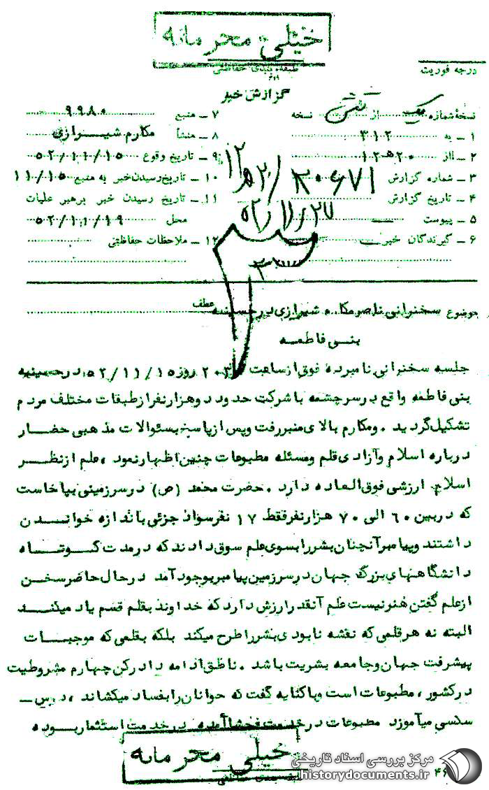 جلسه سخنرانی نامبرده فوق از ساعت 2030 روز 15 /11 /52 در حسینیه بنیفاطمه واقع در سرچشمه با شرکت حدود دوهزار نفر از طبقات مختلف مردم تشکیل گردید و مکارم بالای منبر رفت و پس از پاسخ به سؤالات مذهبی حضار درباره اسلام و آزادی قلم و مسئله مطبوعات چنین اظهار نمود.