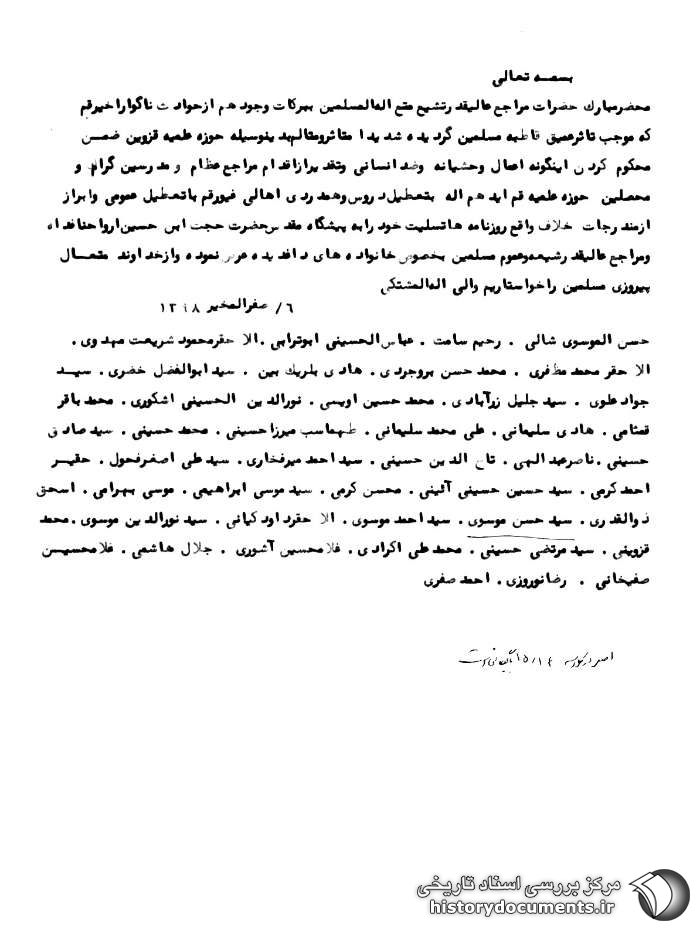 محضر مبارک حضرات مراجع عالیقدر تشیع متعاله المسلمین ببرکات وجودهم از حوادث ناگوار اخیر قم1 که موجب تاثر عمیق قاطبه مسلمین گردیده شدیداً متأثر و متالم به این وسیله حوزه علمیه قزوین ضمن محکوم کردن این گونه اعمال وحشیانه و ضد انسانی و تقدیر از اقدام مراجع عظام و مدرسین کرام و محصلین حوزه علمیه قم ایدهمالله به تعطیل دروس و همدردی اهالی غیور قم با تعطیل عمومی و ابراز انزجار از مندرجات خلاف واقع1 روزنامهها تسلیت خود را به پیشگاه مقدس حضرت حجت بن الحسن2 ارواحنافداه مراجع عالیقدر شیعه و عموم مسلمین به خصوص خانوادههای داغدیده عرض نموده و از خداوند متعال پیروزی مسلمانان را خواستاریم و الی الله المشتکی