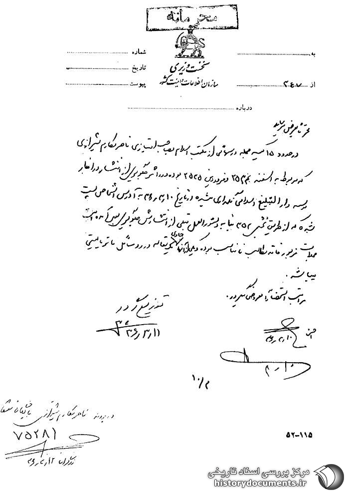 در حدود 15 کیسه مجله درسهایی از مکتب اسلام به صاحبامتیازی ناصر مکارم شیرازی که مربوط به اسفند 2534[1354] و فروردین 2535[1356] بود و در اثر جلوگیری از انتشار در انبار موسسه دارالتبلیغ اسلامی نگهداری میشده در تاریخ 10 /3 /36 به آدرس اشخاص پست شده که از طریق بخش 352 بنا به دستورالعمل قبلی از انتشارش جلوگیری به عمل آمده است. مجلات مزبور فاقد مطالب نامناسب بوده و یکی از آنها حاوی یک مقاله در رد مسائل ماتریالیستی میباشد.