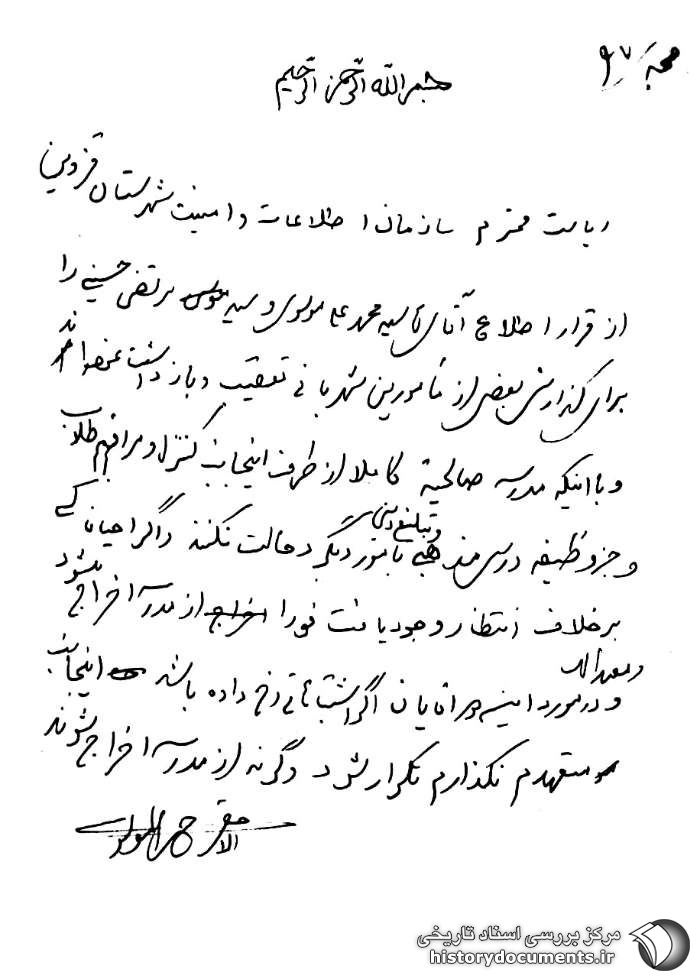 از قرار اطلاع آقای سیدمحمدعلی موسوی و سیدمرتضی حسینی را برای گزارش بعضی از مأمورین شهربانی تعقیب و بازداشت نمودهاند و با اینکه مدرسه صالحیه کاملاً از طرف اینجانب کنترل و مراقبم طلاب جز وظیفه درس مذهبی و تبلیغ دینی به امور دیگر دخالت نکنند و اگر احیاناً کسی برخلاف انتظار وجود یافت فوراً از مدرسه اخراج میشود و معذالک در مورد این آقایان اگر اشتباهاتی رخ داده باشد اینجانب متعهدم نگذارم تکرار شود وگرنه از مدرسه اخراج شوند.